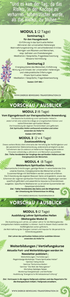 Das Modul 1 ist ein Einstiegerkurs in die spirituelle Heilarbeit und baut eine solide Grundlage für den Eigengebrauch und Hausgebrauch auf. Persönliche Prozesse stehen im Vordergrund, wie z.B. Energetische Abgrenzung, Aktivierungen, Wahrnehmungsschulung,...